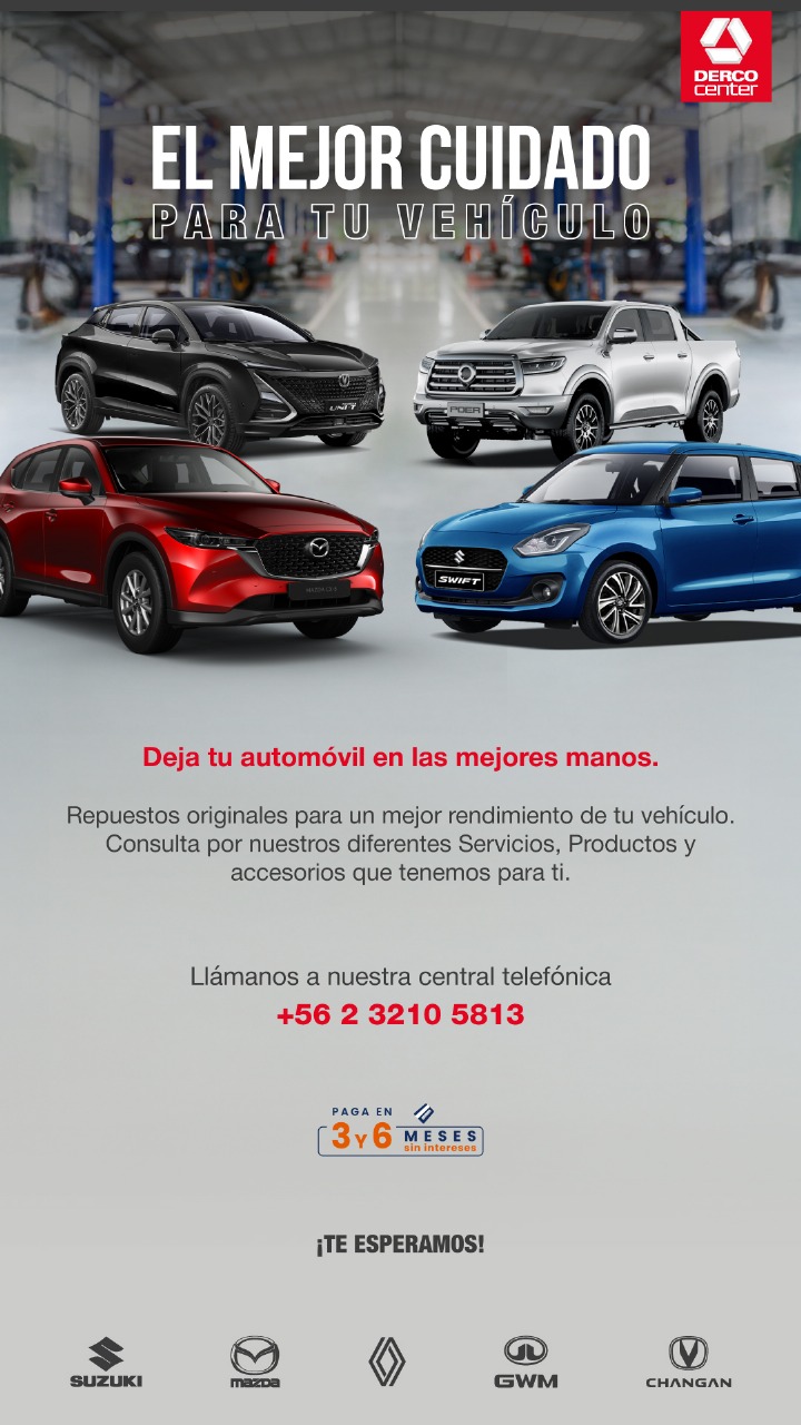 Registra tus datos para agendar Nombre Completo *RUT *0 / 9Télefono *Email *Patente del vehículo *0 / 7Marca *MarcaSUZUKIMAZDARENAULTGWMCHANGANElige tu sucursal *Elige tu sucursalDerco Center MovicenterDerco Center CarreraDerco Center DepartamentalDerco Center Mall Plaza Open KennedyDerco Center La CabañaDerco Center TabancuraDerco Center Mall Plaza OesteDerco Center Changan VitacuraDerco Center GWM Vitacura¿Qué día te gustaría agendar? *¿En qué horario? *¿En qué horario?8:00 a 9:009:00 a 10:0010:00 a 11:0011:00 a 12:0012:00 a 13:0013:00 a 14:00¿En qué horario? *¿En qué horario?9:00 a 10:0010:00 a 11:0011:00 a 12:0012:00 a 13:0013:00 a 14:00EnviarPor favor, no rellenes este campo.